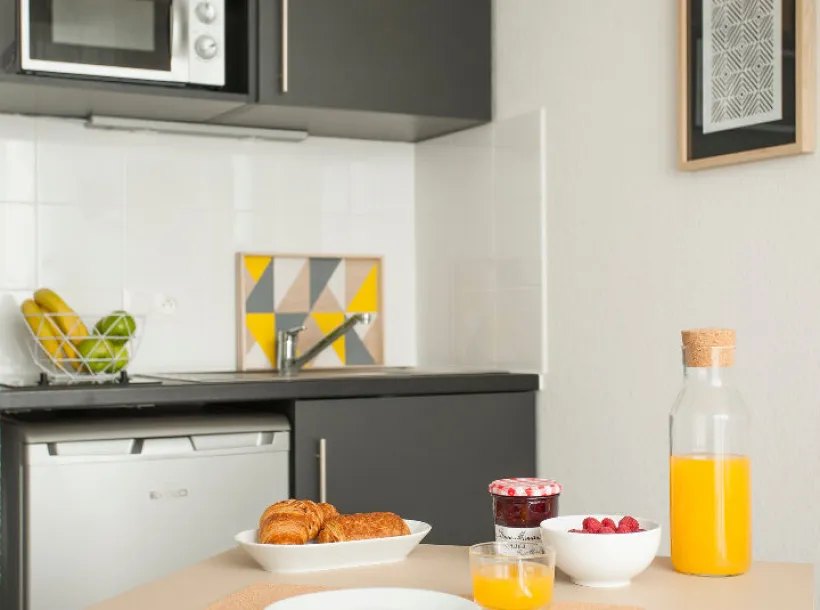Kitchenette équipée avec plaques électriques, réfrigérateur, micro-ondes et vaisselle. Box internet individuelle
