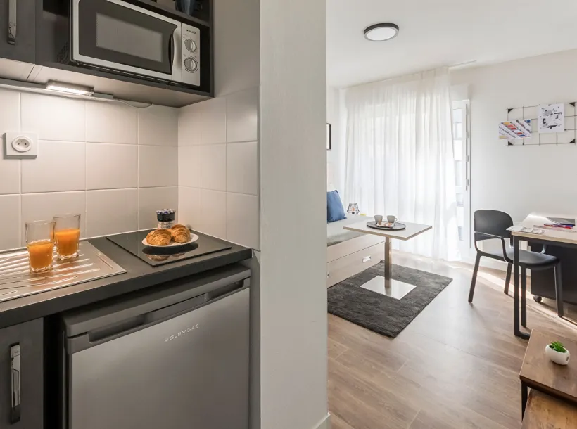 Kitchenette équipée avec plaques électriques, réfrigérateur, micro-ondes et vaisselle. Box internet individuelle