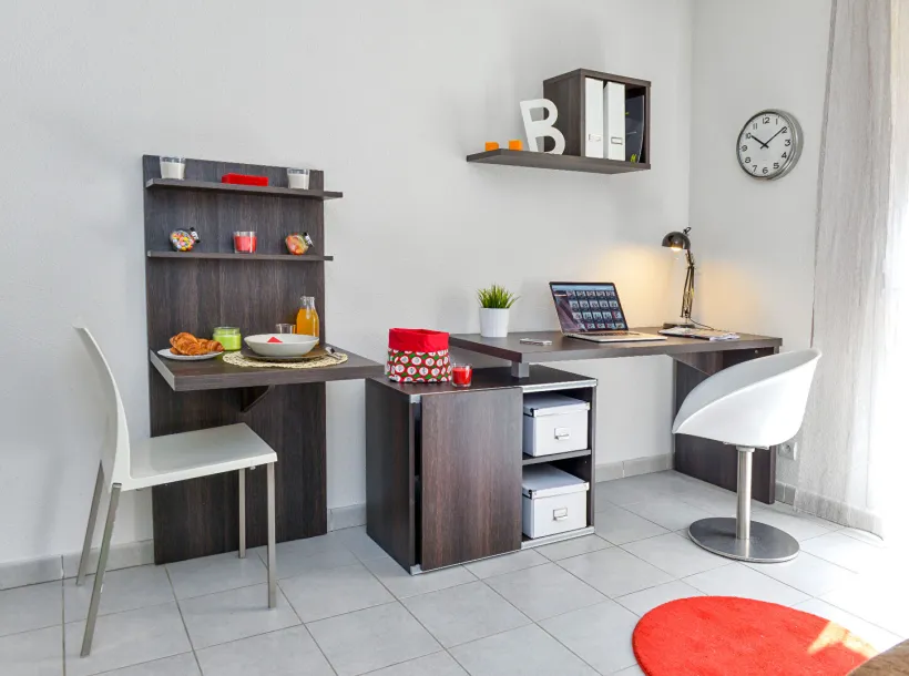 Le studio est entièrement meublé et équipé. Il est composé d’un hall d’entrée, un coin cuisine, une salle d’eau, un bureau et un lit. La résidence étudiante Carré Vérane est située en plein coeur de Toulon, proche des principales lignes de transports, permettant aux étudiants de rejoindre rapidement leur faculté ou école. Les services pour locataire inclus : Box fibre individuelle, laverie équipée, salle commune, local à vélo, salle de fitness, un responsable de résidence etc.