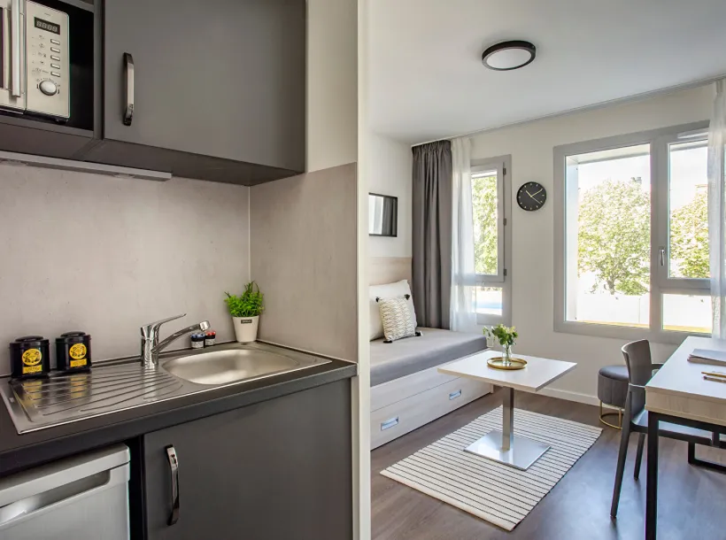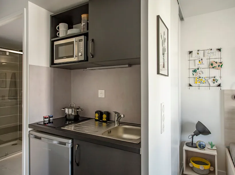 Kitchenette équipée avec plaques électriques, réfrigérateur, micro-ondes et vaisselle. Box internet individuelle